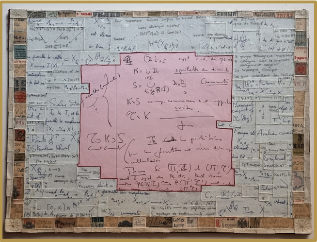 The Institute received a very special gift from artist Dominique Lepetz, a former student of Alexander Grothendieck at the University of Montpellier: a collage featuring an original manuscript by Grothendieck at its centre, surrounded by fragments of mathematical texts by Alain Connes, Laurent Lafforgue and Olivia Caramello.The piece, entitled “Tutto l’universo obbedisce all’amore” (in homage to Franco Battiato), was presented during Lepetz’s exhibition at the event “Mathematics as an artistic experience”, organised by the Institute in Paris last July.